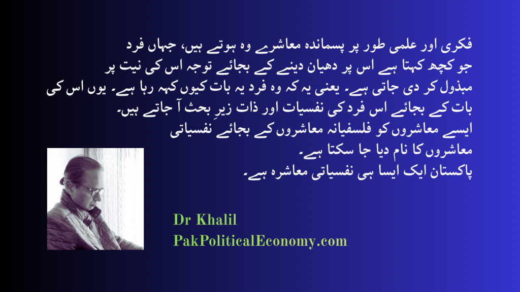 Most Pakistanis are psychological creatures. Only a minority elevate themselves to a philosophical level, and a lot of them now and then relapse again into