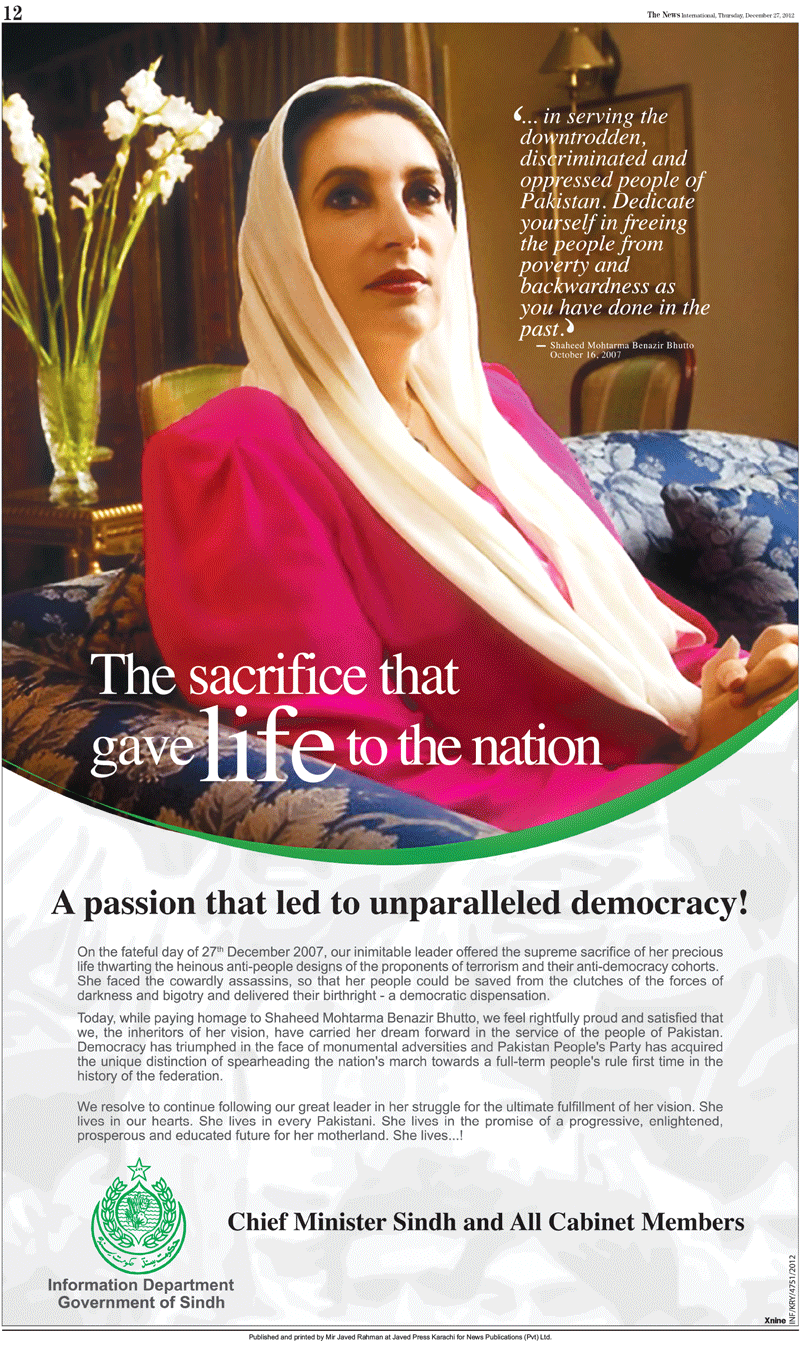 Most of the English and Urdu newspapers of today (December 27), published the following full page advertisement on behalf of “Chief Minister Sindh and All Cabinet Memebrs, Information Department, Government of Sindh.” Also, there are other smaller-size advertisements in almost all of the newspapers sponsored by various government departments.