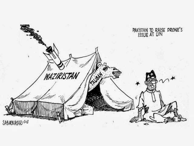 Here is a cartoon by Sabir Nazar, which exposes the fallacy of opposing the Drone attacks. The cartoon published in The Express Tribune on September 26, 2013.